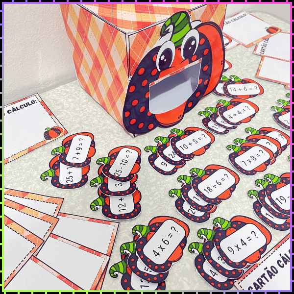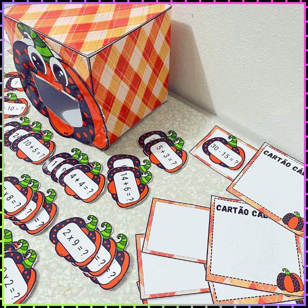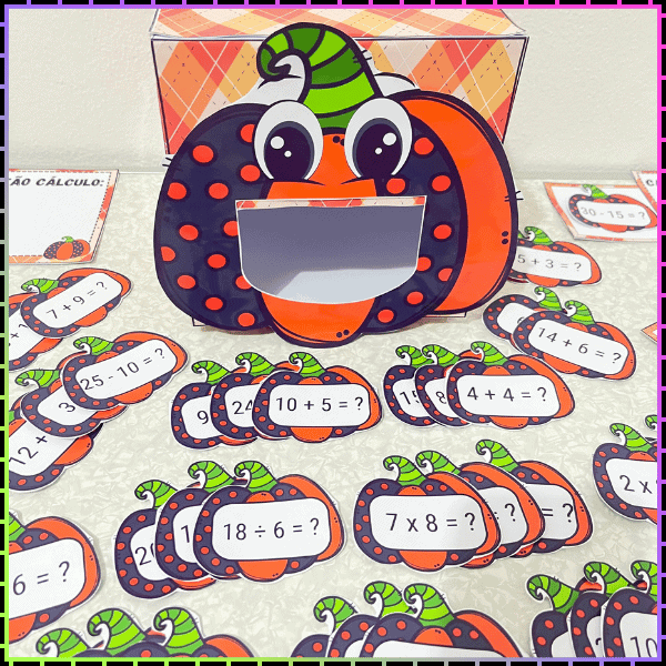 - 🎃 Abra a caixa e retire um card, a criança deve utilizar o cartão cálculo para fazer as operações matemáticas e logo após podem compartilhar o resultado com os colegas.