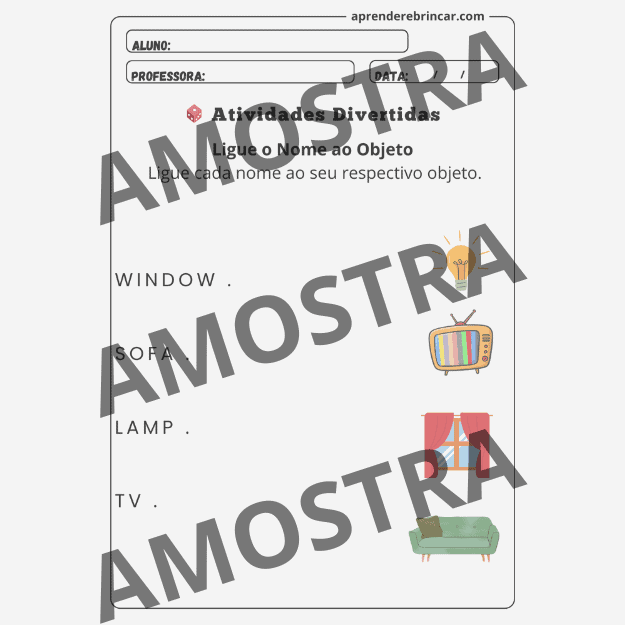 Table (mesa), Chair (cadeira), Bed (cama), Door (porta), Window (janela), Sofa (sofá), TV (televisão), Lamp (lâmpada).Atividades de associação (ligue os pontos)