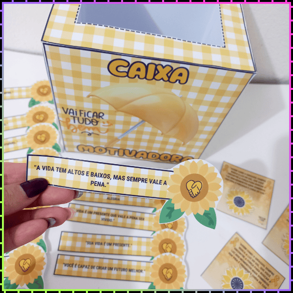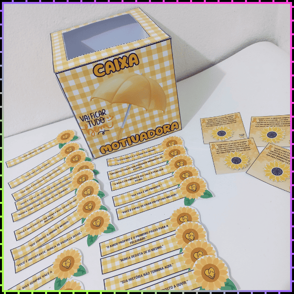 Uma caixa elegante com 30 frases motivadoras acompanhada de um painel decorativo, perfeita para criar um cantinho especial que inspire acolhimento, esperança e positividade.